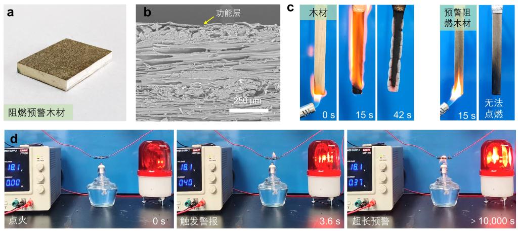 理論在云端,田野在腳下。團隊成員在查閱大量的文獻資料和反復的實驗后,利用木材天然的多尺度孔隙結構,通過功能化處理,制備出了一種擁有高效的阻燃性能、優異的力學性能和智能火災響應性能的多功能木質基材料。這種材料不僅阻燃性能優越,并且當火焰接觸時還能迅速形成導電通路而發出警報,這能及時提醒人們迅速逃生,為生命留下安全時間。