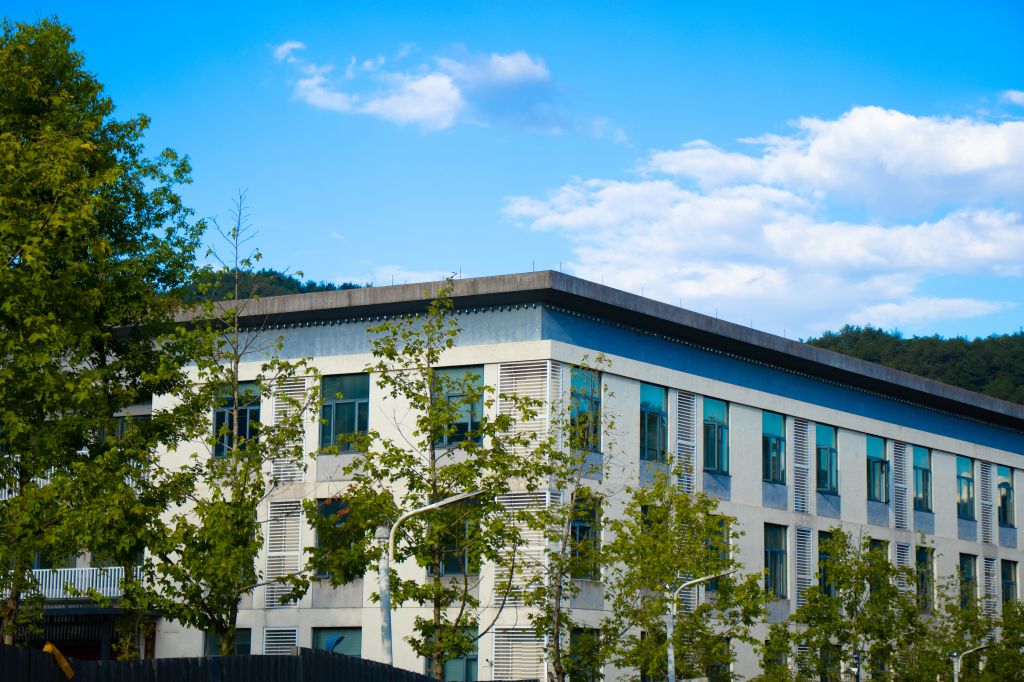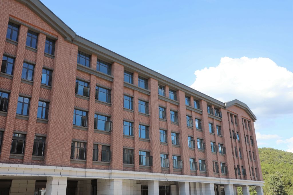 紅墻褐頂的新農科大樓在藍天白云的映襯下,