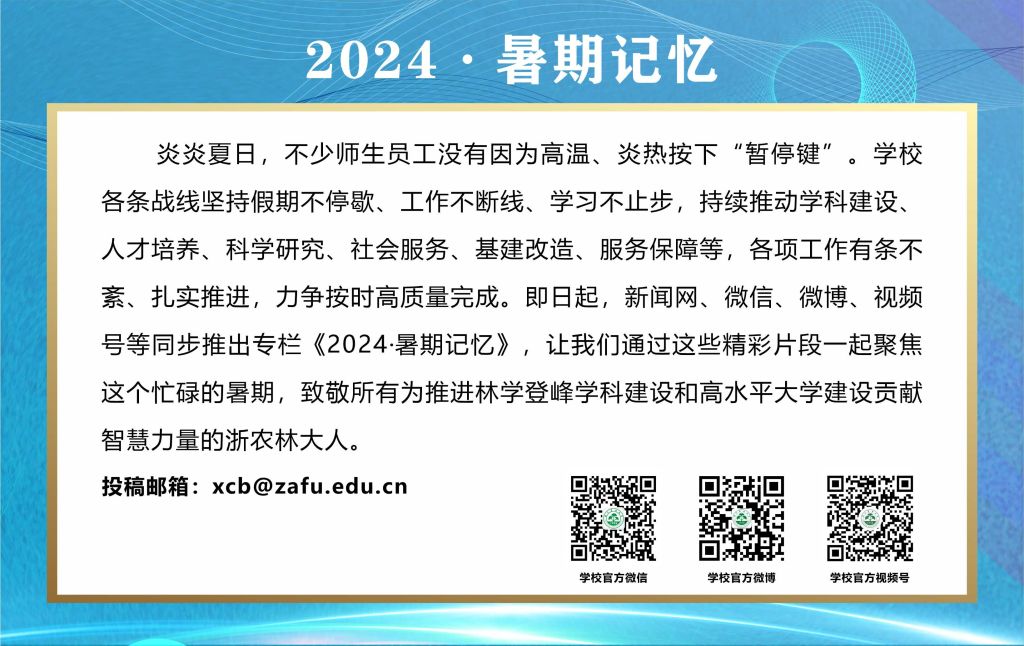 奮斗是青春最亮麗的底色。暑假期間,我校廣大青年學生深入社會開展實踐。他們“尋訪總書記浙江鄉村足跡感悟殷殷囑托實踐偉力”“踐行千萬工程賦能鄉村全面振興”,他們扎實開展“金融消保在身邊 保障權益防風險”“生物多樣性 青年共參與”等專項實踐活動。他們始終牢記殷殷囑托,將熱情與汗水帶到了田間地頭,把論文書寫在廣袤的田野上,用實際行動踐行著屬于浙農林大青年學生的青春擔當。