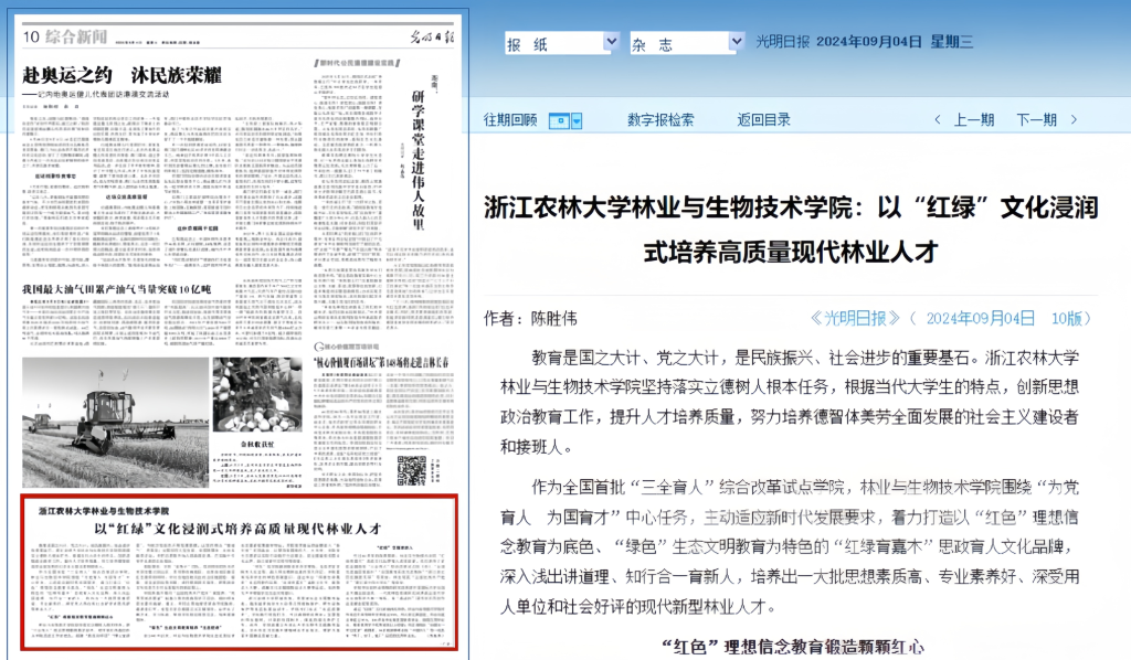9月4日,《光明日報》綜合新聞版報道我校林業(yè)與生物技術學院涉林人才培養(yǎng)的典型做法和創(chuàng)新成效。報道指出,作為全國首批“三全育人”綜合改革試點學院,林業(yè)與生物技術學院圍繞“為黨育人 為國育才”中心任務,主動適應新時代發(fā)展要求,著力打造以“紅色”理想信念教育為底色、“綠色”生態(tài)文明教育為特色的“紅綠育嘉木”思政育人文化品牌,培養(yǎng)出一大批思想素質高、專業(yè)素養(yǎng)好、深受用人單位和社會好評的現代新型林業(yè)人才。