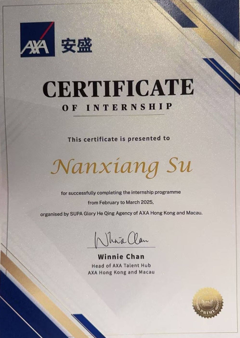 蘇楠翔善于將瑣碎的時間合理利用,爭分奪秒地朝著目標前進。在大學前兩年,他著手準備CFA和FRM證書的學習和考試,并在大三上學期和下學期分別取得了雅思考試7.0與GRE美國研究生考試326分的優秀成績。同時,蘇楠翔還以專業第一的優異成績獲得了一等獎學金、省政府獎學金以及校級“三好學生”的稱號。
