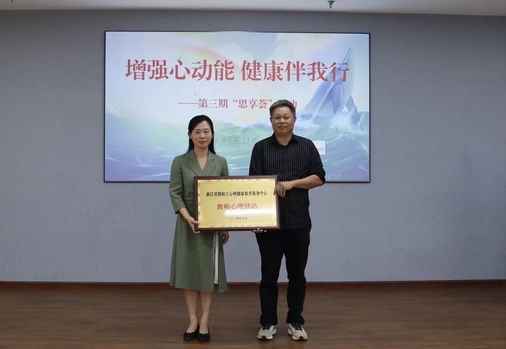 授牌儀式后,舉辦了以“增強心動能、健康伴我行”為主題的教師“思享薈”活動。浙江財經大學教授、國家二級心理咨詢師白羽作了題為《釋放壓力,提升幸福感——教師壓力自我調節》的報告,帶領大家重新認知壓力,全面解讀了開展有效壓力管理的策略,重點介紹了認知調節、行為調節、情緒調節、生活調節四方面“與壓力共舞”的技巧。老師們在現場體驗了經穴敲擊放松法、身體掃描放松法、冥想放松法等釋放壓力的方法,紛紛表示收獲頗多,今后將更加理性應對各種壓力,以積極健康的心態感知美好、感受幸福,擁抱更加快樂的自己。