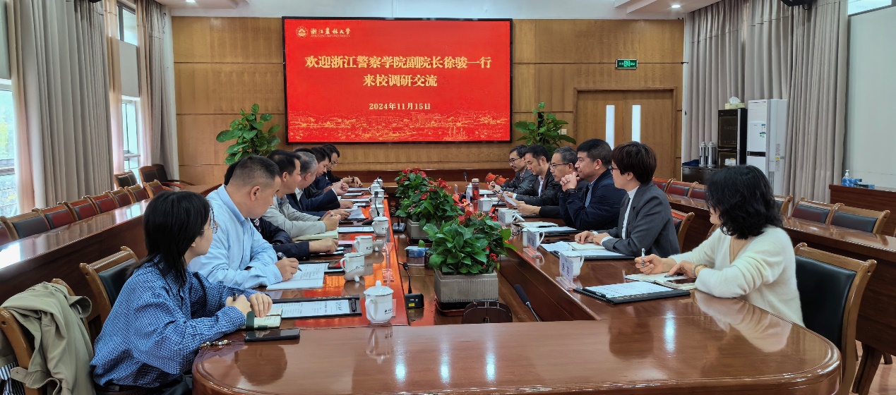 11月15日,浙江警察學院副院長徐駿一行來校調研交流,副校長胡祖吉陪同調研并主持座談會。