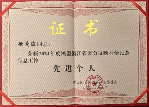 4月25日,民盟省委會2025年參政議政工作會議在杭州召開。會上,對2024年度在參政議政工作及反映社情民意信息工作中表現突出的先進單位和個人進行了表彰。民盟學??傊Й@“反映社情民意信息工作先進組織”稱號,民盟學??傊е魑⒏毙iL徐愛俊獲“反映社情民意信息工作先進個人”稱號。