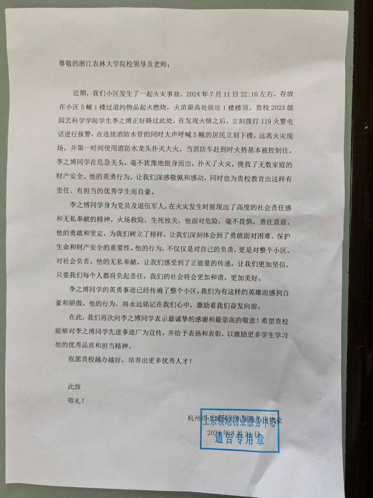 “尊敬的浙江農林大學校領導及老師:近期,我們小區發生了一起火災事故。2024年7月11日22:10左右,存放在小區5幢1樓過道的物品起火燃燒,火苗最高處接近1樓樓頂。貴校2023級園藝科學學院學生李之博正好路過此處,在發現火情之后,立刻撥打119火警電話進行報警,在連接消防水管的同時大聲呼喊5幢的居民立刻下樓,遠離火災現場,并第一時間使用消防水龍頭撲滅大火……”