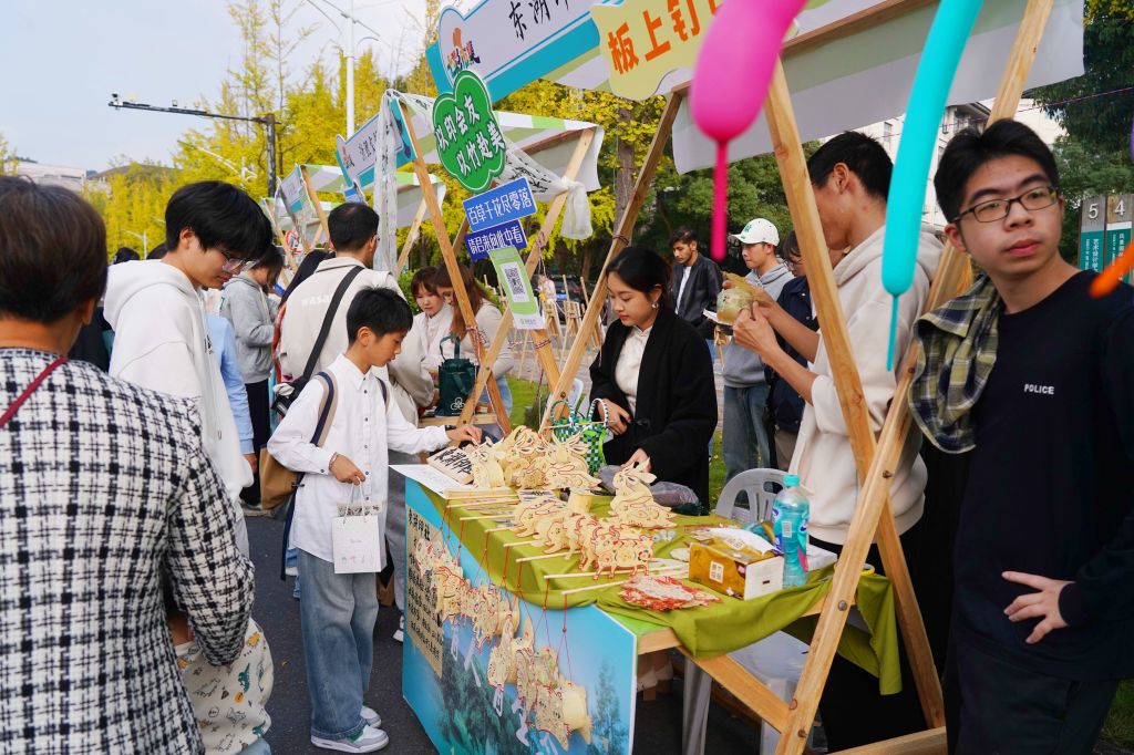 生態嘉年華期間,浙江農林大學校園處處都是生態課堂。立體人造生態系統、寵物義診、多肉養殖展示、玉米手作工藝品、千島湖魚肉小籠包、山地林下仿野生靈芝三葉青、現烤現賣的鮮花罐罐奶茶、“浙西雪鄉”高山蔬菜基地種植的高山蔬菜、鄉村景觀VR自行車、火山爆發小實驗、火線沖擊電碰迷宮、神筆馬良3D打印筆、虛擬現實射擊樂園、閃電魔法球、AR射箭體驗…浙江農林大學東湖校區數百米長的銀杏大道上,7個板塊的166個生態展位的市集活動,內容豐富、形式多樣,限定24小時的嘉年華活動吸引了大家浸潤式體驗。