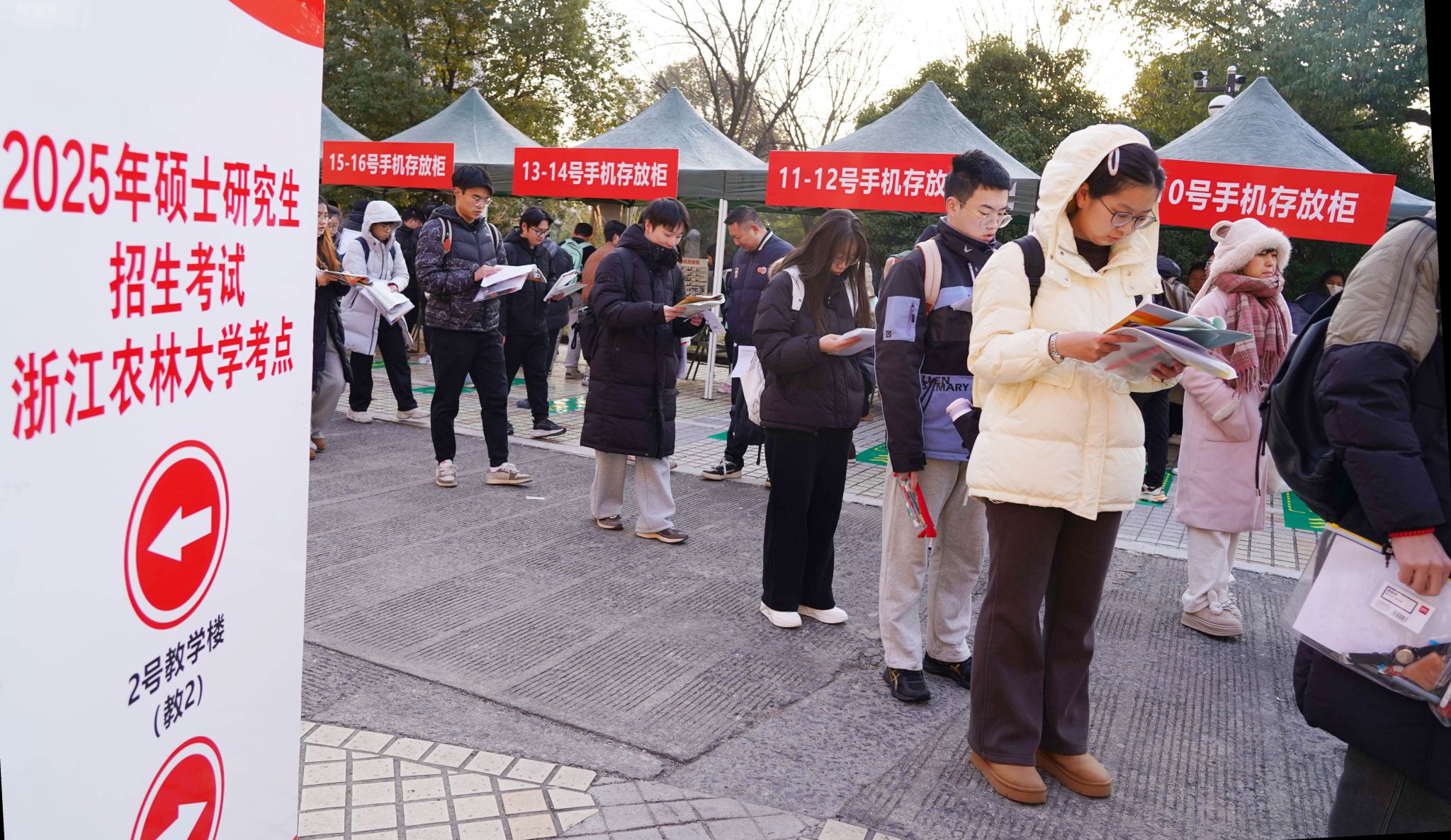 12月21日,2025年碩士研究生招生考試浙江農(nóng)林大學(xué)考點(diǎn),考生將手機(jī)寄存在考場(chǎng)外的手機(jī)存放柜后,排隊(duì)有序進(jìn)入考場(chǎng),認(rèn)真進(jìn)行答題。