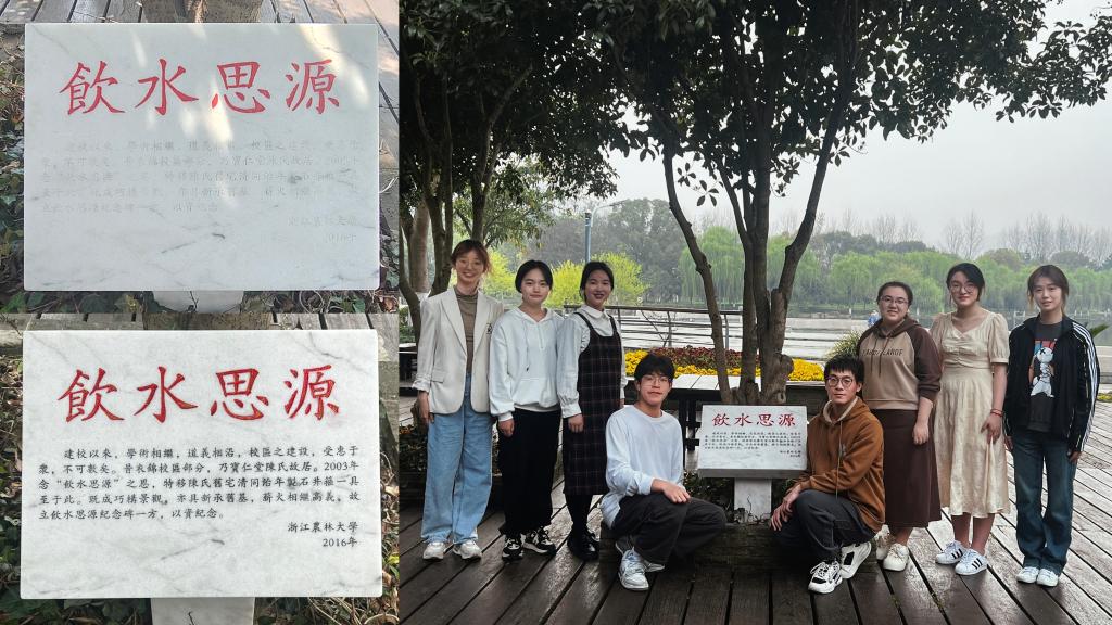 在東湖茶室處的陳年井箍旁,同學們為字跡模糊的“飲水思源”紀念碑補漆增色。東湖茶室處的陳年井箍為陳每文先生祖宅舊物,位于浙江農林大學衣錦校區內,在新校區建設時移至東湖旁。同學們在活動過程中了解到,陳每文先生對浙農林大有著深厚的感情,為浙農林大捐贈400萬元修繕“念慈樓”(紀念慈母),設立“春風春雨助學金”以及“臨安王三妹·陳每文母子助學金”資助學子。同學們以紀念碑補漆為媒,用雙手去觸摸建校背后的人文故事,用心靈去領悟“飲水思源”的深刻內涵。