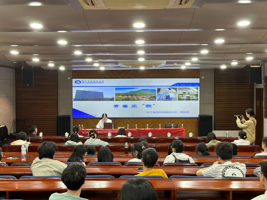 活動中,浙江省皮膚病醫院上柏住院部名譽顧問喻永祥向同學們分享了上柏住院部時代楷模榮譽團隊在“麻風村”堅守十余年默默奉獻青春的故事,傳遞了他們“忍得住清貧,耐得住寂寞”的麻防精神;皮膚科副主任、主治中醫師沈利玲對有關青春痘的健康知識進行了詳細講解,以生動的形式將痘痘的形成機制及其正確處理方法展現在大家面前;整形外科醫生單佳琪用圖片和舉例的形式讓同學們了解到更多平時較少接觸的整形知識,如雙眼皮的類型、如何確定自己適合哪一種雙眼皮等,同學們對健康“美”有了進一步認識。