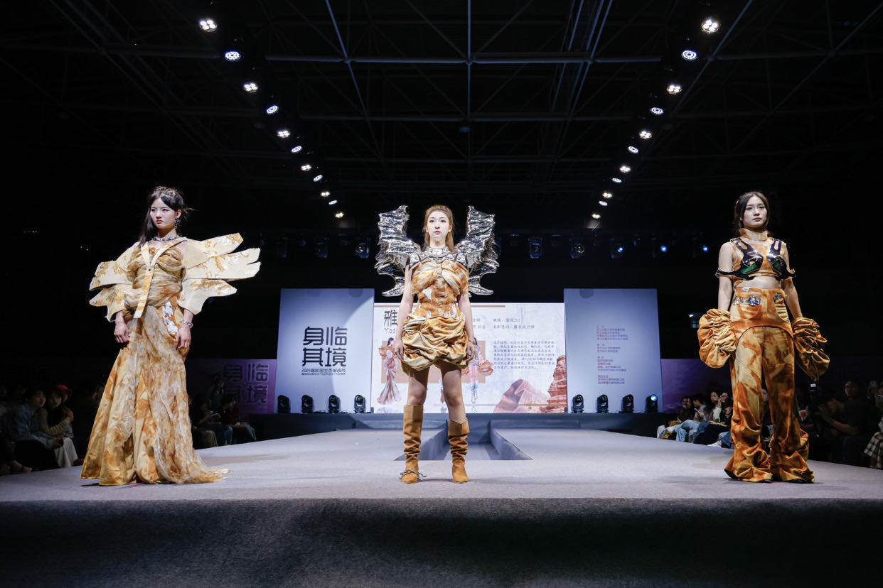 2024屆畢業生們將自身之“境”與深入當下生活的覺察和思考相融相契,尋繹與自然共生的創新設計,圍繞生態可持續設計、服飾與社會關懷、虛擬媒介時代的服飾創新等議題展開多元探索。從傳統非遺“宮燈”、江永女書、壯族織錦、苗族銀飾等元素的現代創新設計,到服裝設計情感療愈功能的探索表達,再到對“賽博朋克”未來感服飾時尚的暢想,本次畢業秀用新穎的服裝語言鏈接傳統與時尚、結合物理世界與數字世界,展示了服裝與服飾設計專業在可持續設計與生態時尚研究方面的最新育人成果。