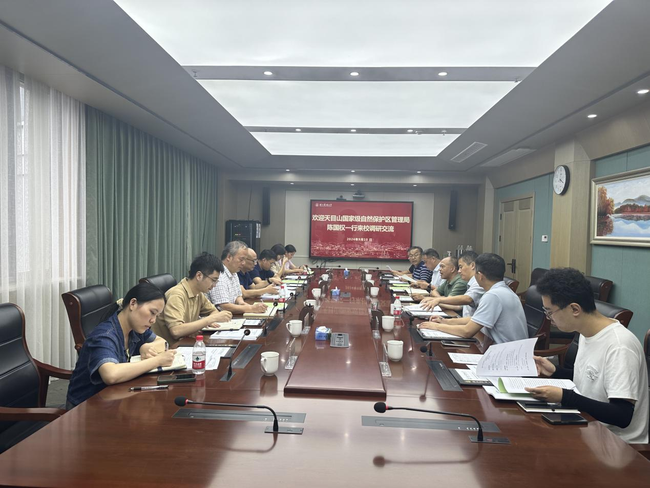9月10日,天目山國家級自然保護區管理局局長陳國權一行來校交流座談,科技處處長柳丹、林生院相關負責人及相關學科教師參加。