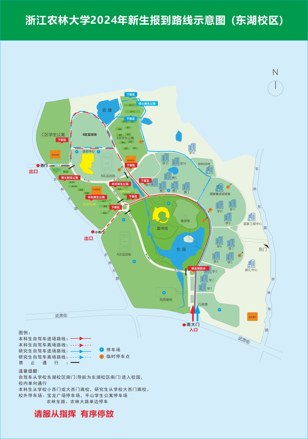 為方便新生報到車輛通行,建議各師生員工盡量綠色出行,非必要不開車,確需開車進校,請服從工作人員的指揮引導。請各學院(部)、各部門提醒廣大師生員工提前做好出行安排。后勤保障車輛請錯峰出行。