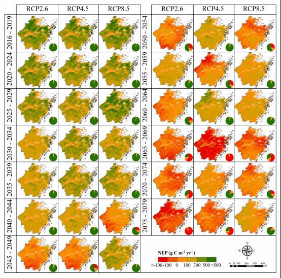 研究表明,從1979年到2015年,浙江省森林生態系統NEP(Net Ecosystem Productivity,凈生態系統生產力)總體呈上升趨勢,年均增加量9.66 g C m-2yr-1,累積NEP為365 Tg C;而2016年到2079年,NEP雖總體呈下降趨勢,但仍大于歷史NEP,同時累積NEP持續增加,至2079年,RCP2.6、RCP4.5和RCP8.5等三種不同情景下累積NEP分別為750 Tg C、866 Tg C和958 Tg C。因此,到2079年,三種氣候情景累積NEP最大可達958 Tg C,是2015年之前累積NEP的2.6倍,說明浙江省森林生態系統碳匯潛力巨大。