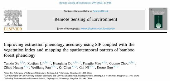 近日,國家重點實驗室森林碳匯研究團隊在遙感領域國際頂尖期刊《Remote Sensing of Environment》(中國科學院1區Top,IF=13.85)在線發表題為“Improving extraction phenology accuracy using SIF coupled with the vegetation index and mapping the spatiotemporal pattern of bamboo forest phenology”(SIF結合植被指數改進物候提取精度和竹林物候時空格局制圖)的學術論文。國家重點實驗室森林碳匯研究團隊PI杜華強教授為通訊作者,李雪建副教授為共同通訊作者,博士研究生徐延鑫為第一作者,團隊負責人周國模教授指導相關研究工作,毛方杰副教授參與相關研究。