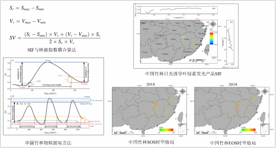 氣候變化影響物候,并通過物候(生長期開始SOS、生長結束EOS)調節植被光合等生理、生態過程。因此,物候對植被碳固定、碳水循環及其時空演變都有重要的影響,一直是國內外研究的前沿和熱點問題。目前,國內外多采用NDVI、EVI、EVI2和NIRv等植被指數(VIS)來提取植被物候時空分布信息的。然而,這些植被指數不能從光合過程揭示植被物候狀態,且難以提取亞熱帶森林植被物候信息。竹林是我亞熱帶森林生態系統的重要組成部分,固碳潛力強大,具有大年小年交替及爆發式生長等特殊物候現象,精準監測竹林物候及其時空分布對全面刻畫竹林碳循環過程具有重要意義。
