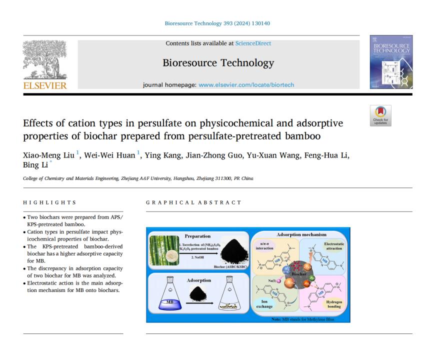 近日,我校化材學院應用化學專業2021級本科生劉小萌,在李兵教授指導下,以第一作者在國際著名期刊 Bioresource Technology(IF=11.889,中科院一區,TOP期刊)上發表題為“Effects of cation types in persulfate on physicochemical and adsorptive properties of biochar prepared from persulfate-pretreated bamboo”的研究論文。