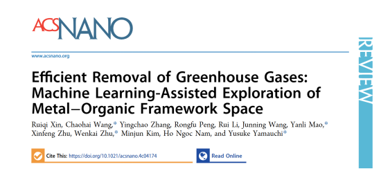 7月2日,林業(yè)工程學(xué)科綠色家居材料團(tuán)隊在國際材料領(lǐng)域頂級期刊《ACS Nano》(中科院1區(qū),IF=15.8)在線發(fā)表題為“Efficient Removal of Greenhouse Gases: Machine Learning-Assisted Exploration of Metal?Organic Framework Space”(機(jī)器學(xué)習(xí)賦能面向溫室氣體去除的金屬有機(jī)骨架)的綜述論文。第一作者是該團(tuán)隊碩士研究生辛瑞麒,通訊作者為浙江農(nóng)林大學(xué)朱文凱,合作作者包括河南城建學(xué)院王超海教授、毛艷麗教授以及昆士蘭大學(xué)Yusuke Yamauchi教授。浙江農(nóng)林大學(xué)化學(xué)與材料工程學(xué)院為該論文第一單位和通訊作者單位。