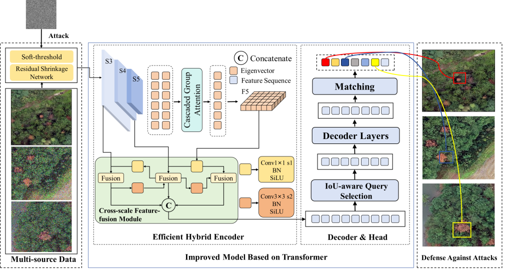 無人機遙感目標識別在軍事、農業、林業和建筑等各個領域發揮著至關重要的作用,準確的目標識別對這些領域的發展至關重要。團隊提出了一種新的多源森林遙感數據融合框架SC-RTDETR,以Transfoermer為主要結構,結合Soft-threshold模塊和Cascaded-Group-Attention模塊,旨在提高遙感目標探測系統抵御攻擊的彈性。SC-RTDETR在特征提取階段采用了一種高效的軟閾值自適應濾波方法動態調整閾值,過濾多源森林遙感圖像中的攻擊因素。此外,該模型還在編碼器中引入了注意力機制。該機制有效地減輕了檢測器在攻擊下產生的冗余信息。通過采用分組和級聯策略,模型可以更有效地捕獲和利用復雜場景中圖像的重要特征。