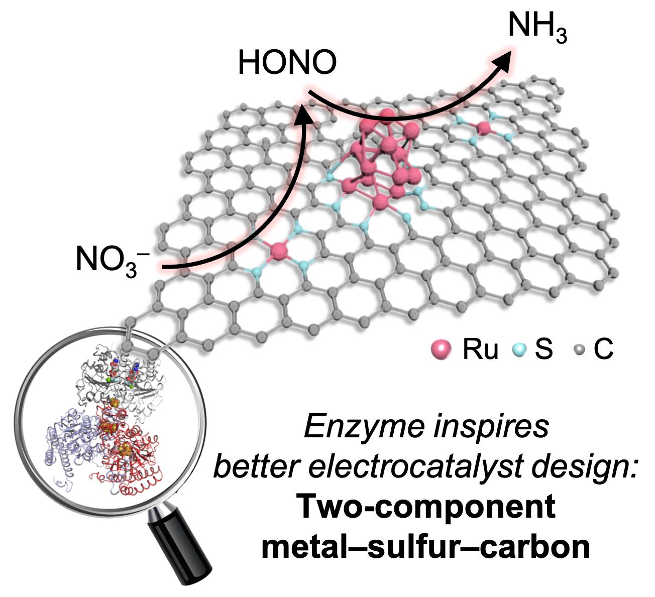 該團隊設計了一種由兩種酶的結構酶學啟發的雙組分M-S-C催化劑,并通過表征和機制探究實驗進一步探索了其結構依賴性,以通過電化學硝酸還原(NitRR)合成氨。我們觀察到,只有當Ru SAs和NPs共存時,催化劑才能達到最高性能。這種(SAs + NPs)/S-C表現出顯著的NH3產率約為~37 mg L-1h-1和法拉第效率約為~97%,持續超過200小時,并且超過了大多數報道的電催化劑。實驗和理論研究揭示了Ru SAs與S配位在促進HONO中間體的形成和隨后在相鄰Ru NPs上的還原反應中的關鍵作用。因此,S-C負載的NPs與SAs之間的協同作用與雙組分氮化酶催化作用表現出顯著的相似性。這項工作擴展了SACs的構型空間的限制,并有助于氨合成催化劑的合理設計。