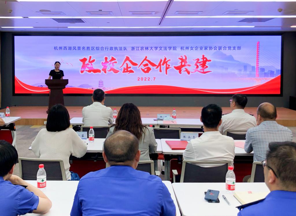 杭州市婦聯黨組成員、副主席陳佳出席此次活動并致辭。她指出,舉行此次活動,是杭州西湖風景名勝區綜合行政執法隊、浙江農林大學文法學院以及杭州市女企業家協會聯合黨支部三方通力合作、共謀發展的有力體現,三方積極推動人才培養,有助于開創政校企合作新局面。
