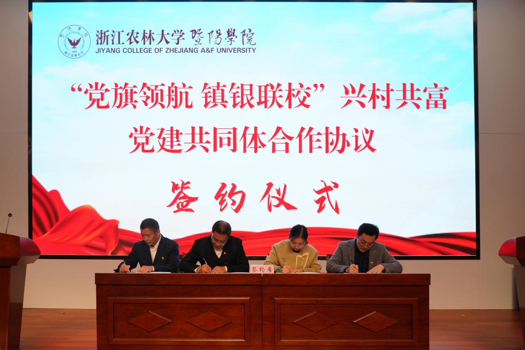 11月17日,經濟管理學院黨委與暨陽學院黨委、諸暨市應店街鎮黨委、中國銀行諸暨支行黨總支聯合舉辦了“黨旗領航 政銀聯校”鄉村共富黨建共同體簽約儀式。