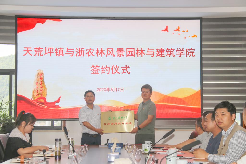 近日,園林學院開展“大走訪大調研大服務大解題”活動, 與安吉縣天荒坪鎮人民政府簽訂黨建共建合作協議,并舉行校外實踐教育基地授牌儀式。園林學院院長趙宏波、黨委書記陳審聲等相關領導,天荒坪鎮黨委書記賀苗、黨委委員及大溪村書記陳軍等參加座談和簽約儀式。