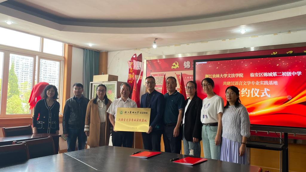 10月19日上午,文法學(xué)院與臨安區(qū)錦城第二初級(jí)中學(xué)(以下簡稱“錦城二中”)簽署共建漢語言文學(xué)專業(yè)實(shí)踐教學(xué)基地協(xié)議,并舉行揭牌儀式。文法學(xué)院黨委書記朱紅東及學(xué)院、中國語言文學(xué)學(xué)科、漢語言文學(xué)專業(yè)相關(guān)負(fù)責(zé)人,錦城二中校長凌平、副校長厲仁華、教務(wù)主任、各年級(jí)語文組備課組長等參加了簽約及揭牌儀式。