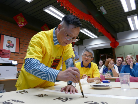 孫一鳴代表海天集團向諾大孔院捐贈了書法用品和文化用品,介紹了海天集團的基礎業務和現有規模。洪君佩現場展示了書法,引來學生圍觀欣賞。