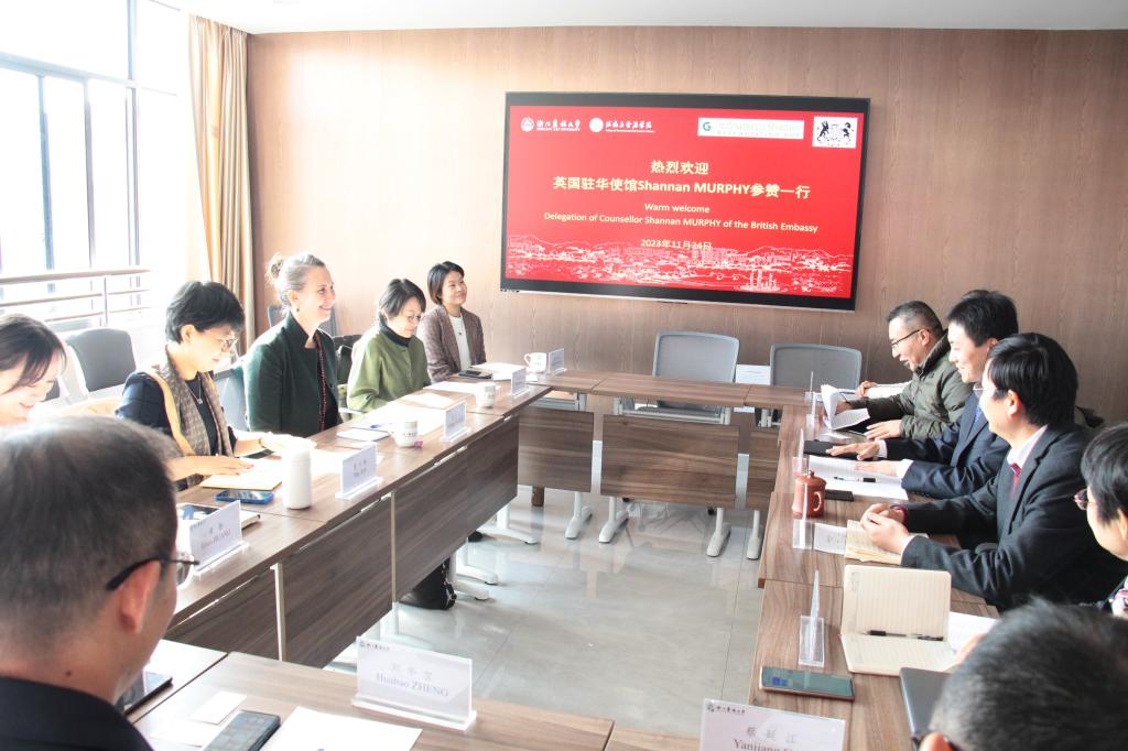 經學院相關負責人邀請,英國駐華大使館氣候變化、能源與環境參贊孟姍蘭(Shannan Murphy)、英國駐上海領館、北京綠研公益發展中心成員一行8人于11月24日訪問環資院、碳中和學院,國際處相關負責人主持召開座談會,環資院院長馮華軍致辭、學院相關負責人和教授代表參加座談。