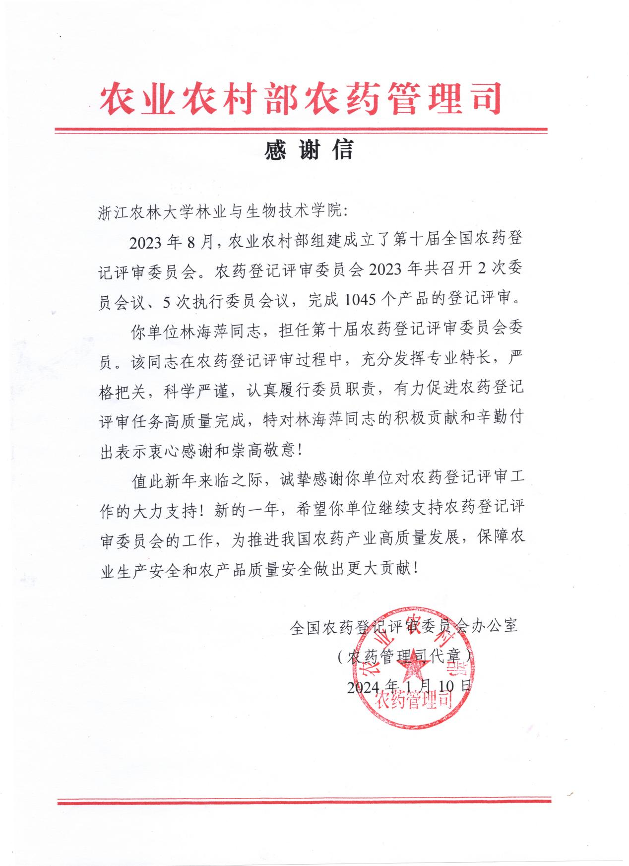 近日,林生院收到農業農村部農藥管理司發來的感謝信,對于林生院林海萍教授在擔任第十屆農藥登記評審委員會委員期間,對國家農藥登記評審工作的大力支持表示誠摯的感謝。