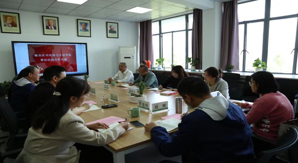 4月15日,臨安區司法局副局長程萬里一行到文法學院洽談普法合作。文法學院黨委書記朱紅東等學院領導及法學學科教師代表參加座談。