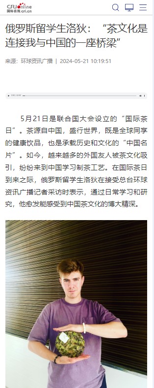 5月21日是聯(lián)合國大會(huì)設(shè)立的“國際茶日”,我校茶學(xué)院來自俄羅斯的留學(xué)生洛狄接受了國際在線記者的采訪。