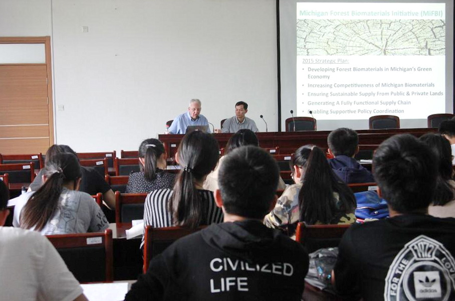 雙方就人才培養、重點領域科學研究等辦學情況進行了介紹交流。Terry Sharik教授和謝新峰教授結合密歇根州生物質材料研究中心的發展歷程與儲能碳和集成液化分離方面的最新進展,分別作了題為《啟動密西根州森林生物質材料研究,創建一個可再生可持續發展的未來》和《基于木材納米和分子結構的生物質材料》的學術報告,重點分析了生物質材料研究中心在高附加值產品和市場擴展等重點領域的新機會與生物材料小尺度上的獨特天然結構在未來木質生物材料高附加值利用中的潛在優勢。