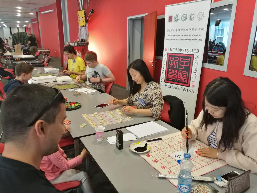 在游戲體驗區,孔院老師準備了跳棋、象棋等中國特有的棋類游戲,當地民眾們對中國棋類表現出了濃厚的興趣,踴躍參加,相互競賽;在文化展示區,孔院老師則展示了中國傳統書法,現場為民眾寫名字,民眾們贊不絕口;孔院本土漢語教師娜塔莎(Natasha)作了“中國龍”的文化講座。