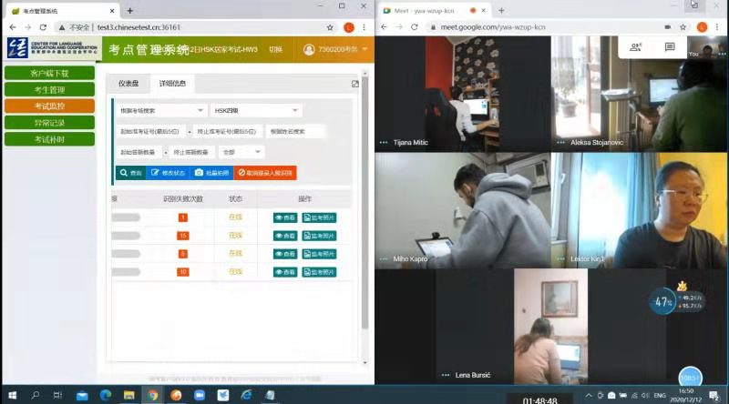 為合理有序地應對新形勢下的考試新模式,諾維薩德大學孔子學院按照漢考國際的要求和《居家網絡考試管理手冊》的規定,多次組織召開考前會議,全體教師積極參加相關培訓,認真學習考試系統的操作規范,預估突發事件并商討出處理辦法。在考前一個星期內,孔子學院分級別給考生舉行了多次培訓,針對考生客戶端下載、模擬測試、考試環境檢測等方面,對考生進行遠程指導與溝通,解答考生的問題,確保每位考生熟知考試當天流程與操作。