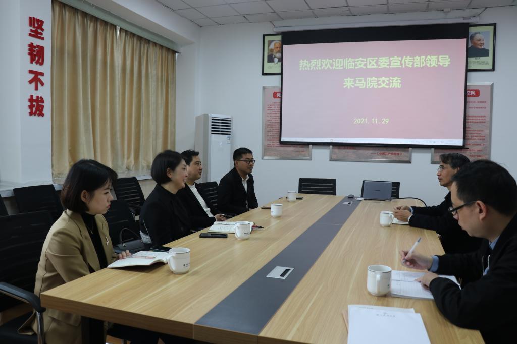 11月29日,臨安區委宣傳部常務副部長郭增,區委宣傳部副部長、文明辦主任陶國英等一行4人等來馬克思學院就校地合作工作進行了探討和交流。學院院長高君、辦公室和教師代表參加了會議。